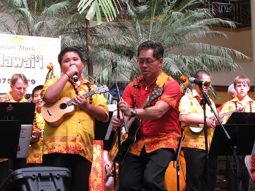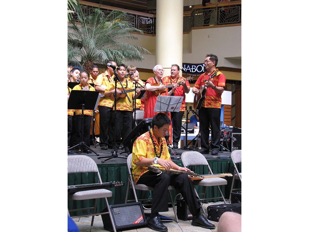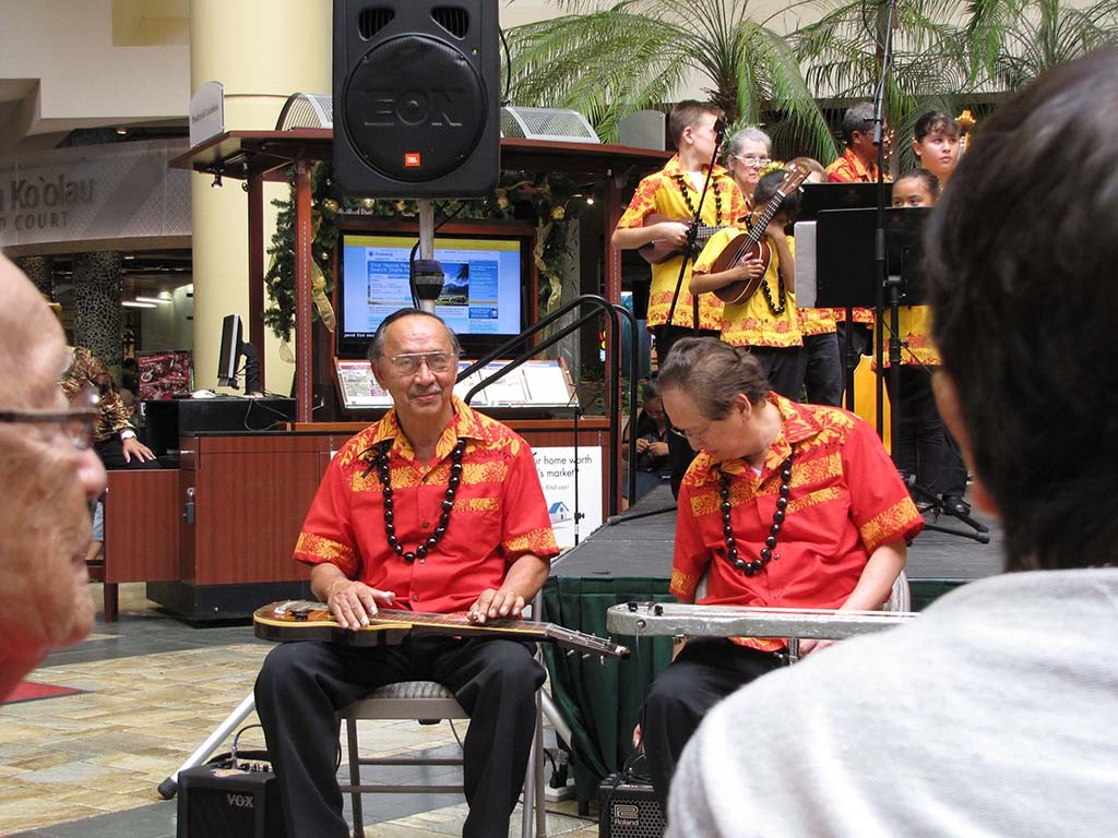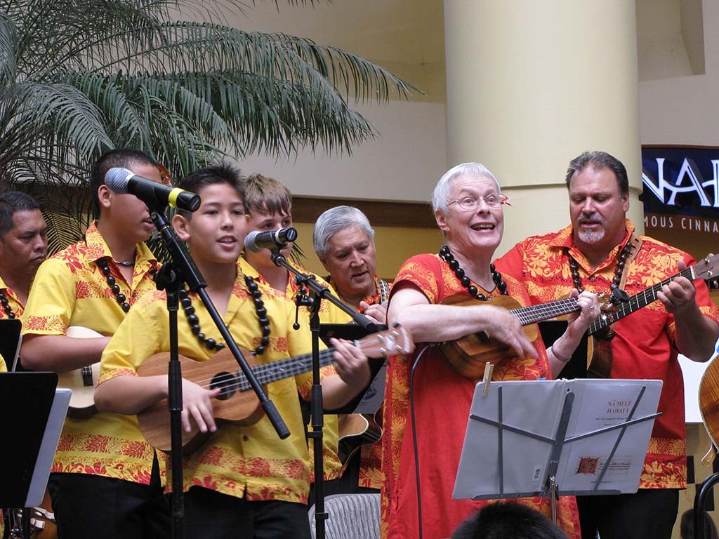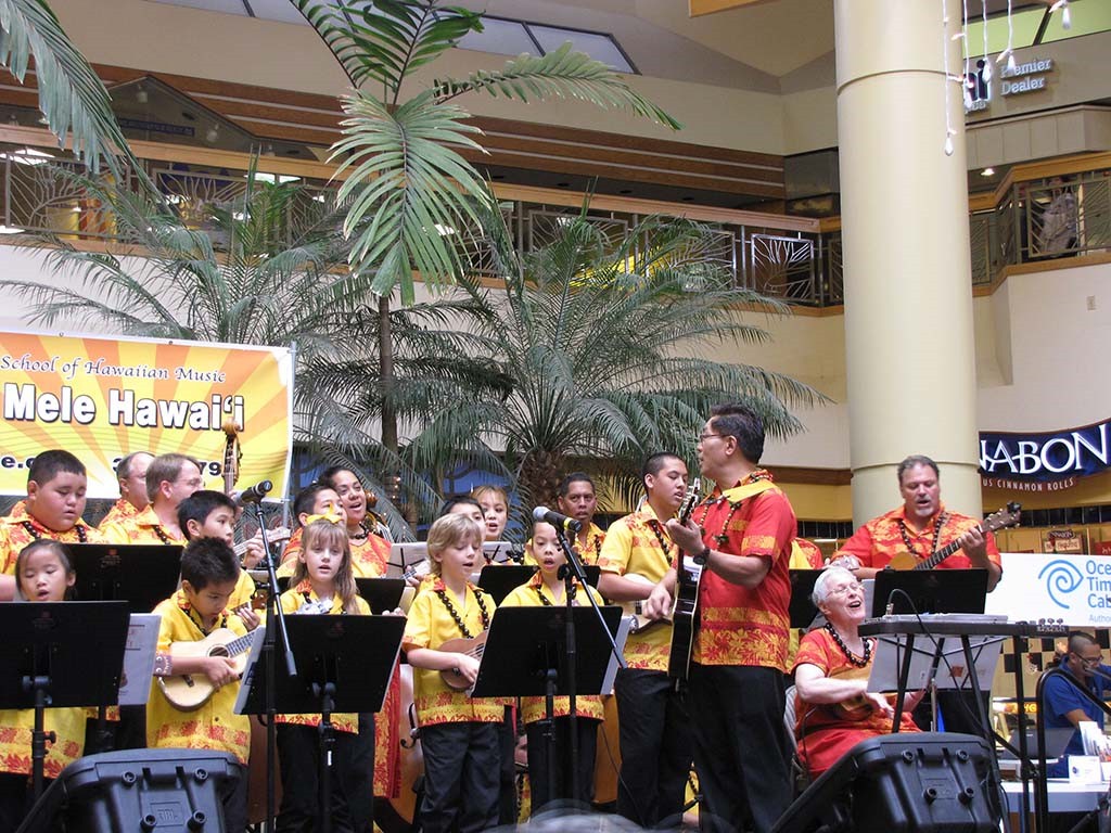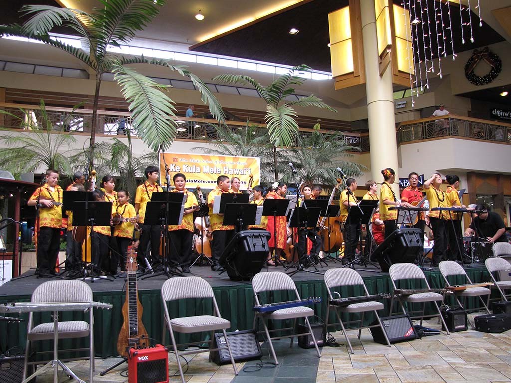 The annual Winter concert was presented by the haumana of Ke Kula Mele School of Hawaiian Music at the Windward Mall on December 26, 2011. The concert featured a collection of traditional Hawaiian songs, Christmas carols, and some "fun" songs such as "Menehune Beach Bum Boogie," "Hawaiian Roller Coaster Ride," and the theme from Hawaii 5-0. A steel guitar ensemble featuring eleven steel guitarists performed an arrangement of Makalapua.