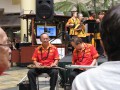 Summer makes an announcement as Sid Pang adjustments his steel guitar.