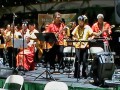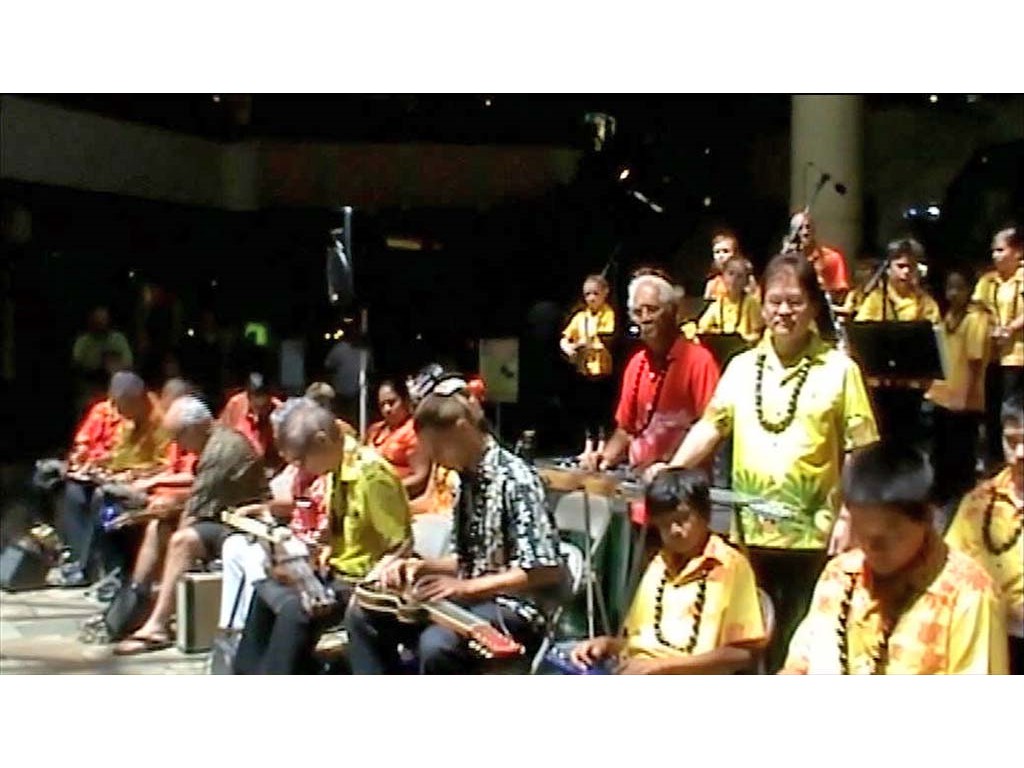 Part 1 of the Steel Guitar ensemble playing Nani Waimea. Front, from left: Clement Villanueva, Ron Sugiyama, Earl Ng, Fred Barnett, Matt Kobayashi (Japan), Yoshiyuki Endo (Japan), Nicholas Alamia, Keen Ching, Sid Pang. Rear: Ron Johnson,