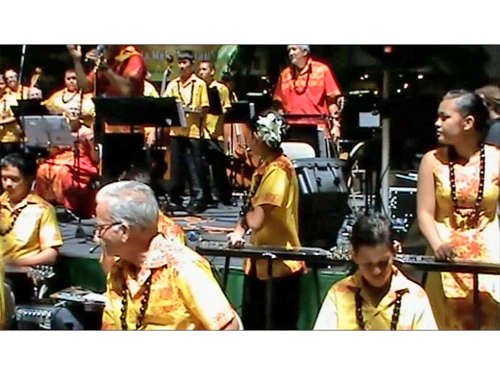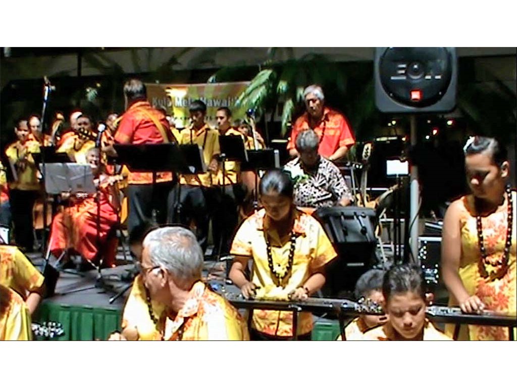 Greg Sardinha joins the ensemble. Kuapapa is seen behind Raven, carrying a portable microphone to each amplifier as that steel guitarist solos.Photography captures from videography by Ronald Tolentino ©2012 by Ke Kula Mele Hawai‘i.