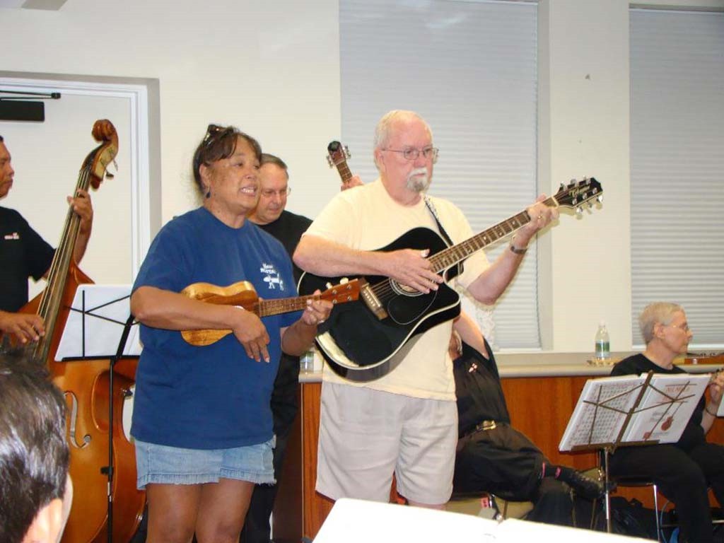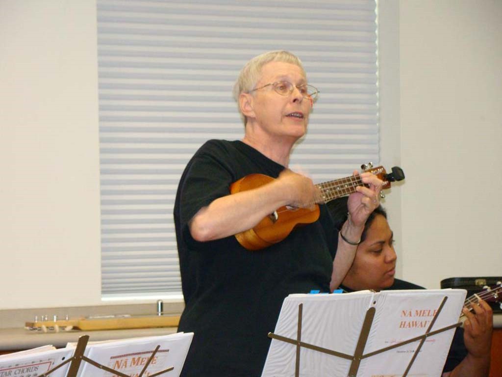 Guest artists Carmen and Keith Haugen with Ke Kula Mele haumana Leroy Ne, Lance Hylander, and Gale Warshawsky.