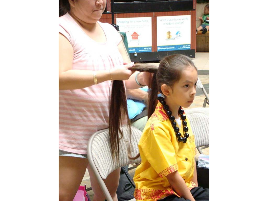 Andrea Tolentino assists Kianna with her hair.