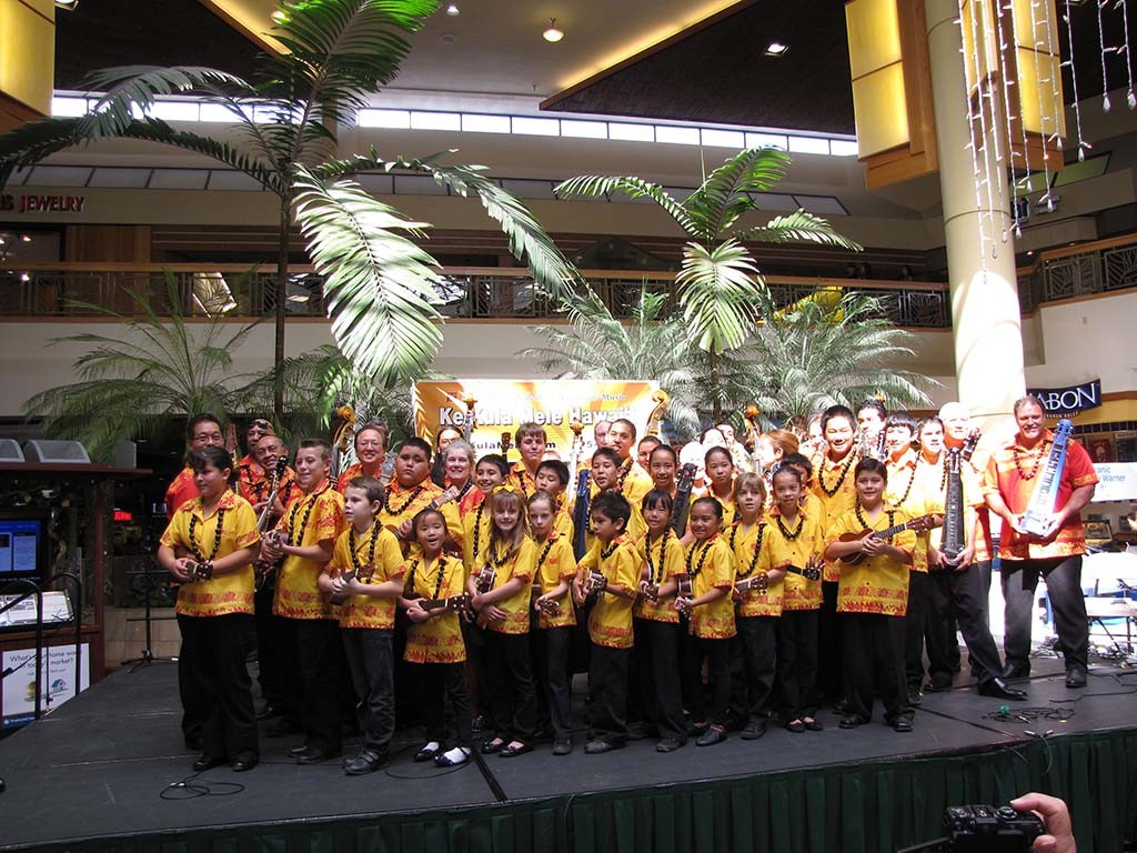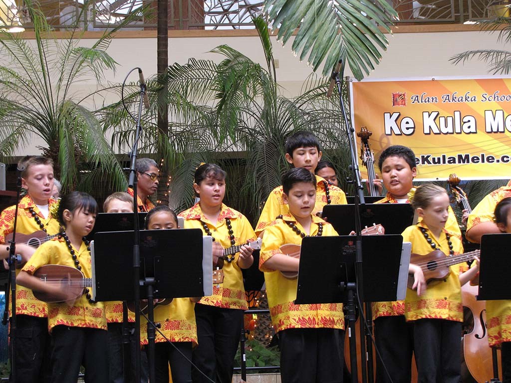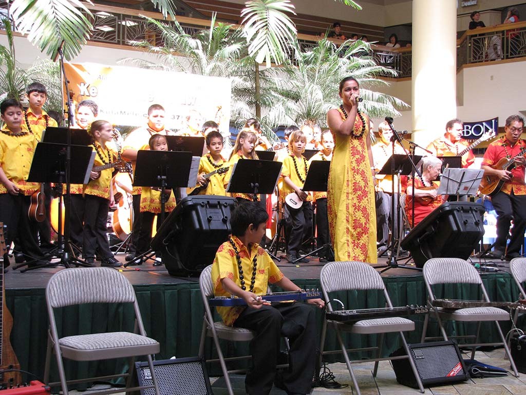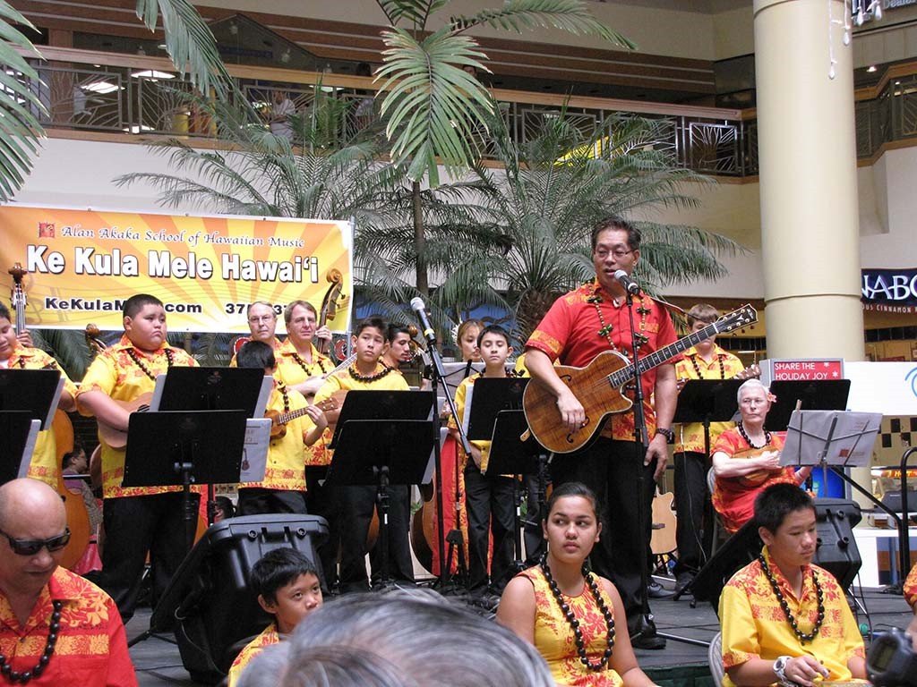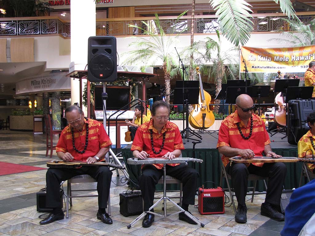 The annual Winter concert was presented by the haumana of Ke Kula Mele School of Hawaiian Music at the Windward Mall on December 26, 2011. The concert featured a collection of traditional Hawaiian songs, Christmas carols, and some "fun" songs such as "Menehune Beach Bum Boogie," "Hawaiian Roller Coaster Ride," and the theme from Hawaii 5-0. A steel guitar ensemble featuring eleven steel guitarists performed an arrangement of Makalapua.