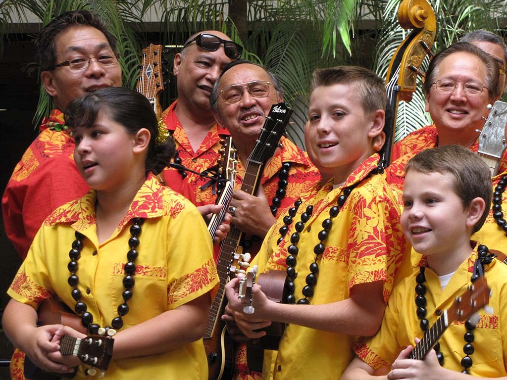Kumu Alan Akaka with the featured keiki steel guitarists Mikaela, Raven and Alexis.