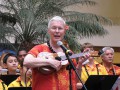 Kumu Alan Akaka, Gale Warshawsky, and Henry Wassman III (in red) sing along with the haumana.