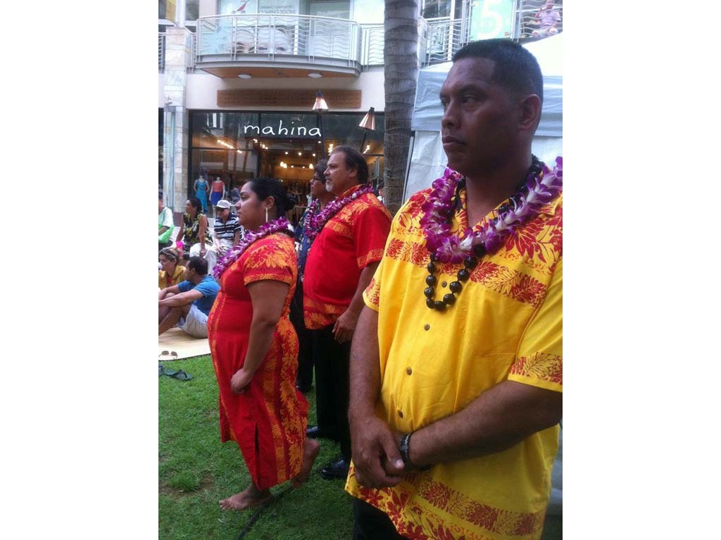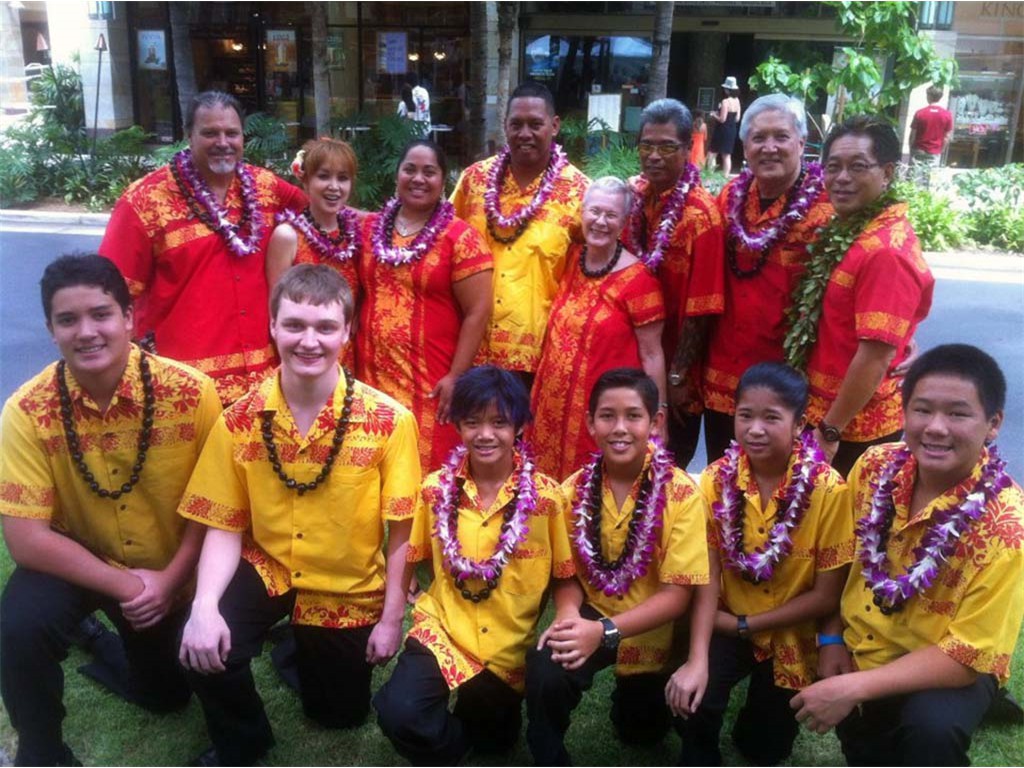 Ke Kula Mele participants. Fromt: Quincy Maka'awa'awa, Mark Prucha, Keen Ching, Raven Young, Alexis Tolentino. Rear: Henry Wassman III, Michiko Akaka, Jamie Umanzor, Leroy Ne, Gale Warshawsky, Ronald Tolentino, Addison Ching, and Kumu Alan Akaka.