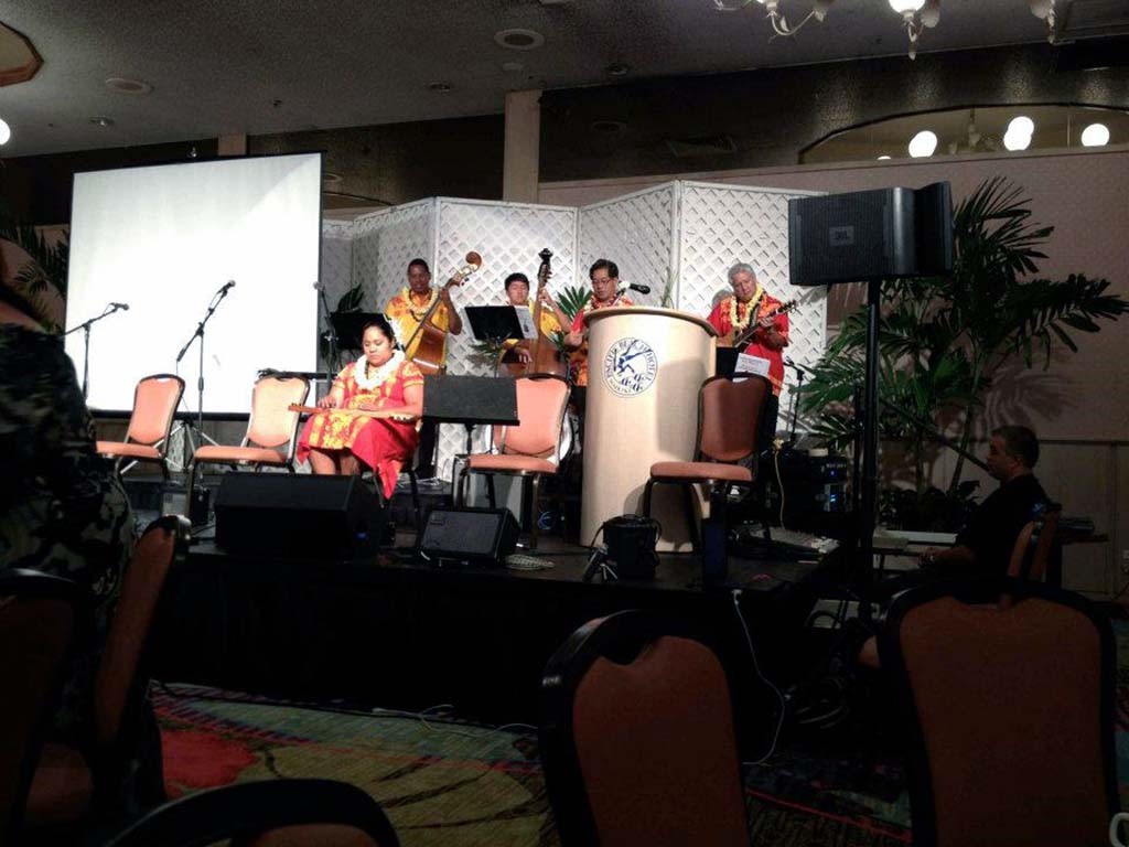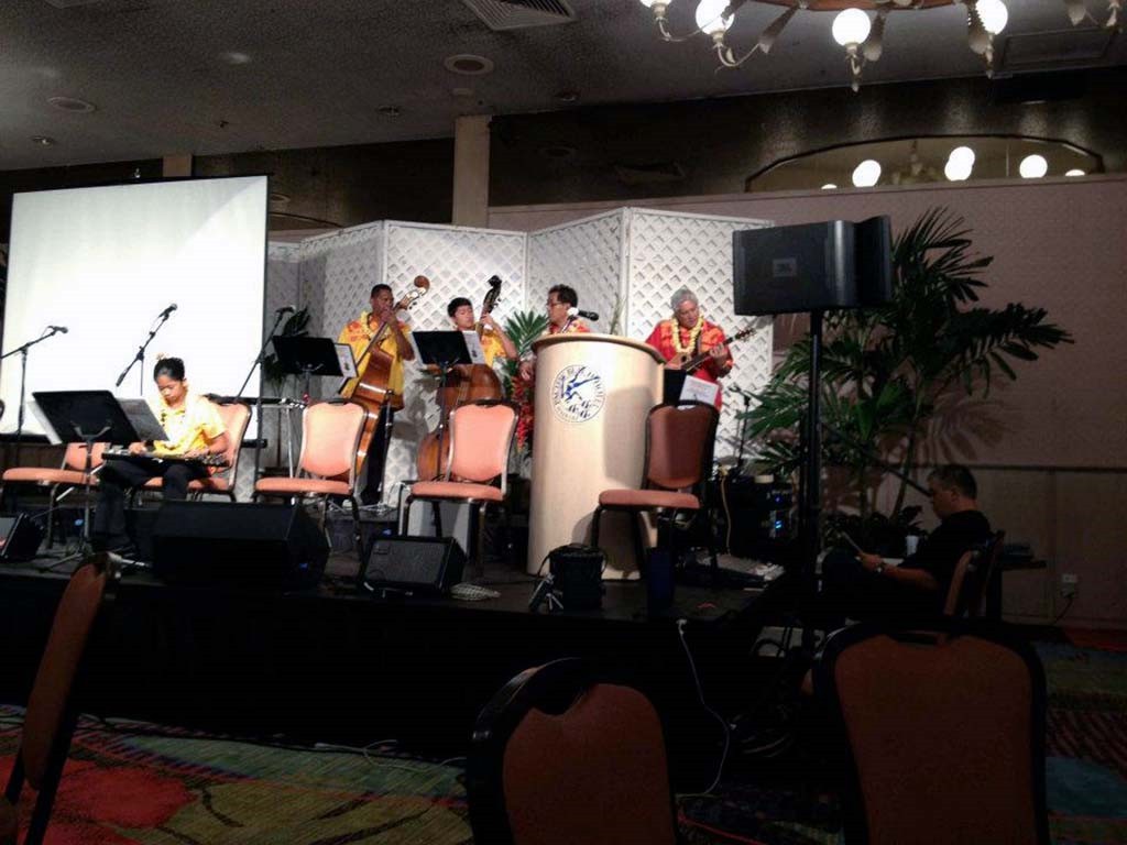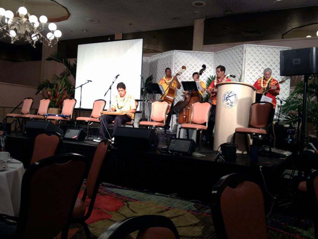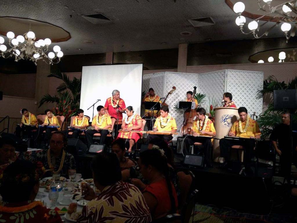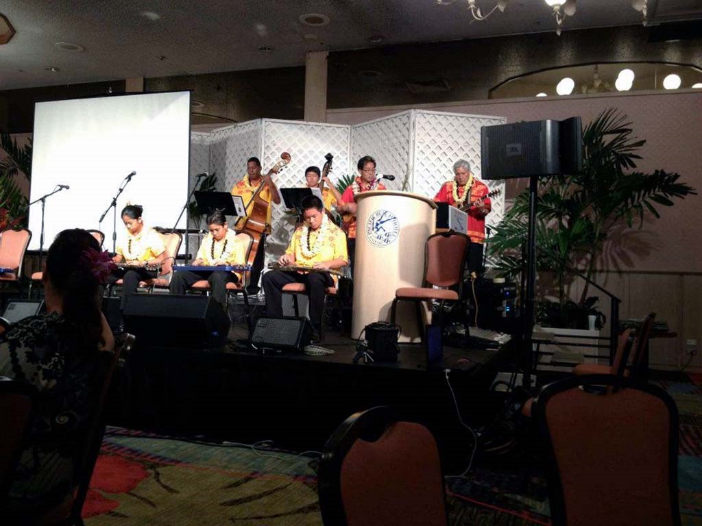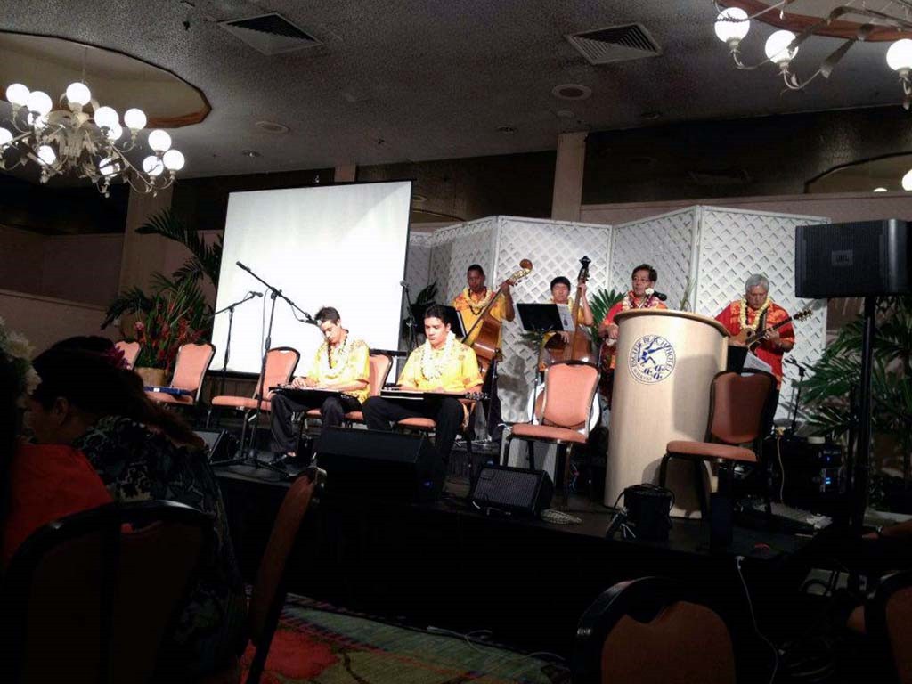 Alexis Tolentino, Raven Young, and Sid Pang accompanied by Leroy Ne, Zach Pang, Kumu Alan Akaka, and Addison Ching.