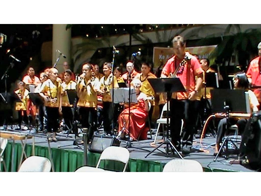 Greg Sardinha joins the ensemble. Kuapapa is seen behind Raven, carrying a portable microphone to each amplifier as that steel guitarist solos.Photography captures from videography by Ronald Tolentino ©2012 by Ke Kula Mele Hawai‘i.