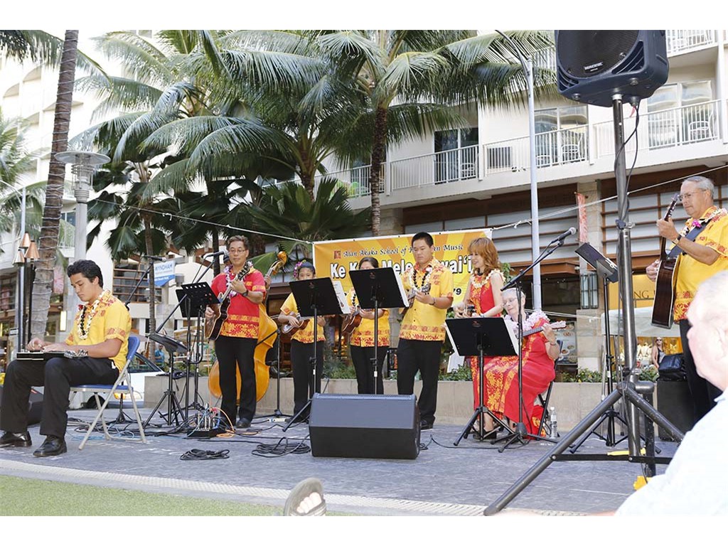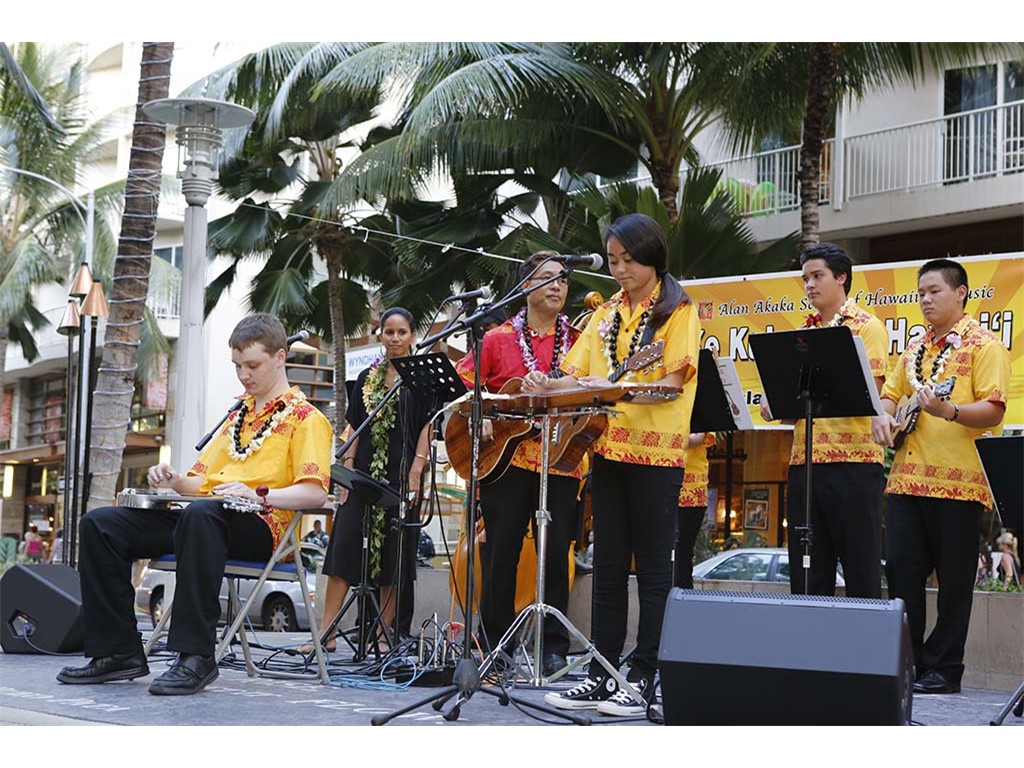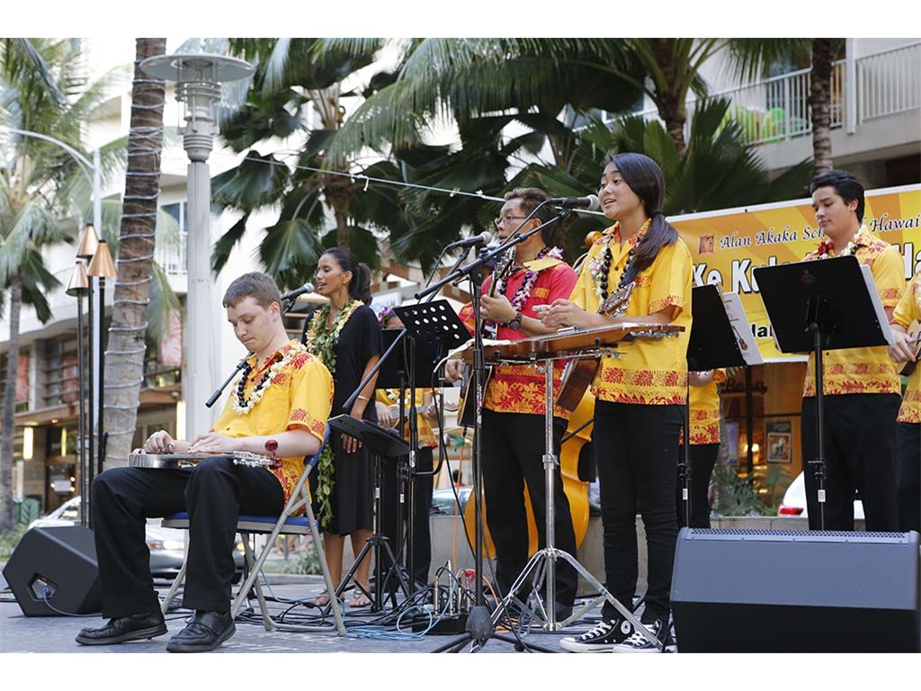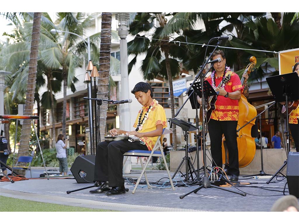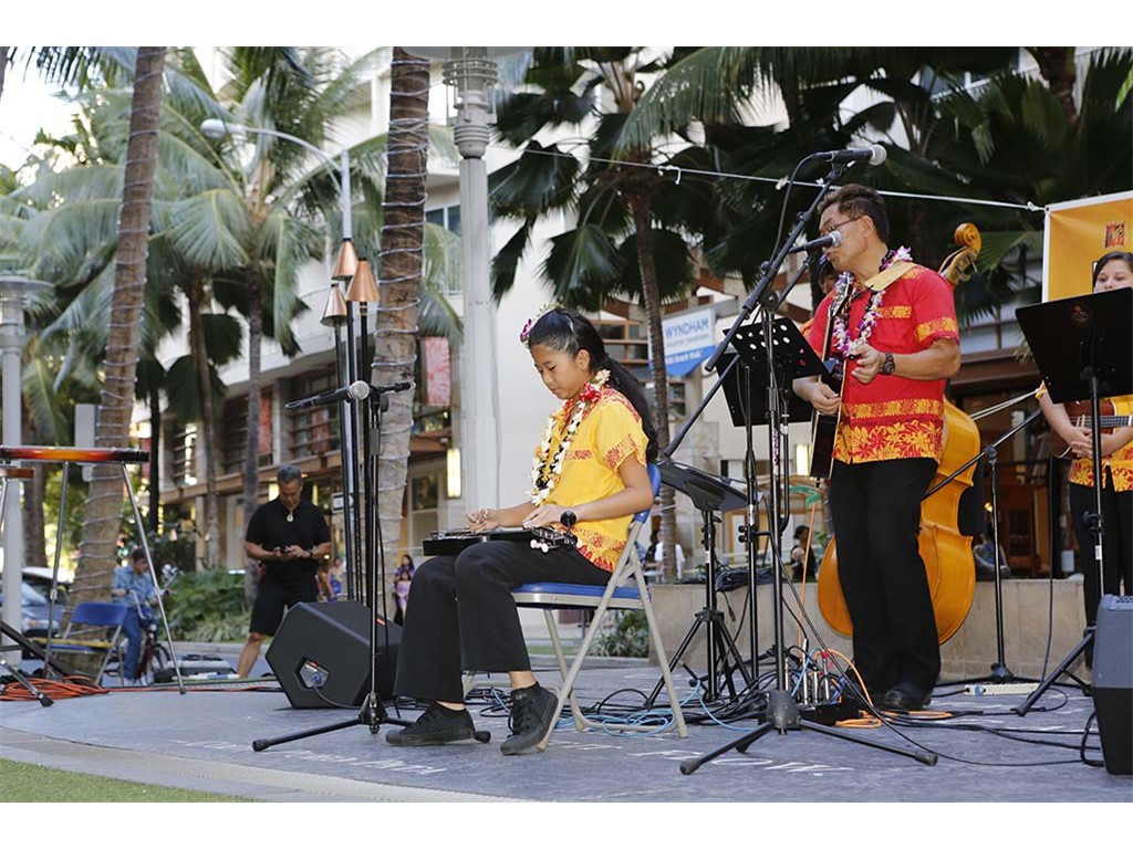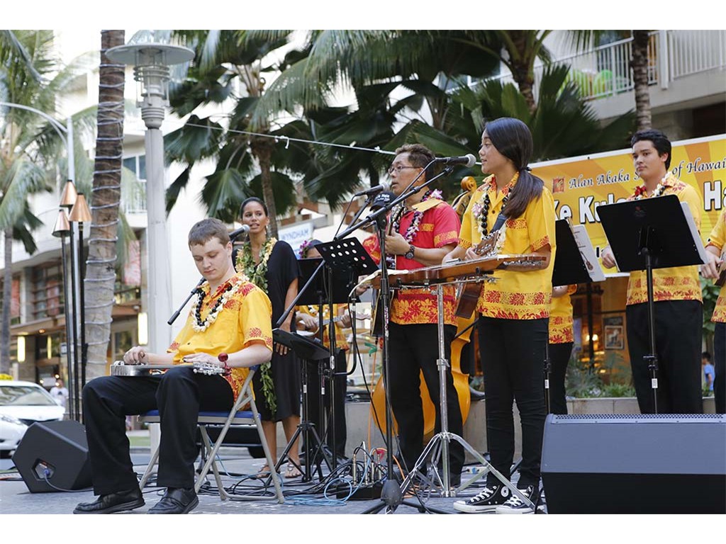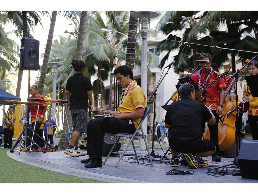 Ke Kula Mele Hawai‘i NextGen steel guitar players strutted their stuff at the 4th Annual Hawaiian Steel Guitar Festival at Waikīkī Beach Walk. Steel guitarists Alexis Tolentino, Quincy Maka‘awa‘awa, Sid Pang, Kalyn Aolani, Mālie Lyman, Keen Ching and Mark Prucha represented the NextGen players.