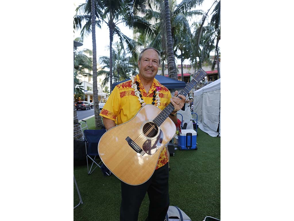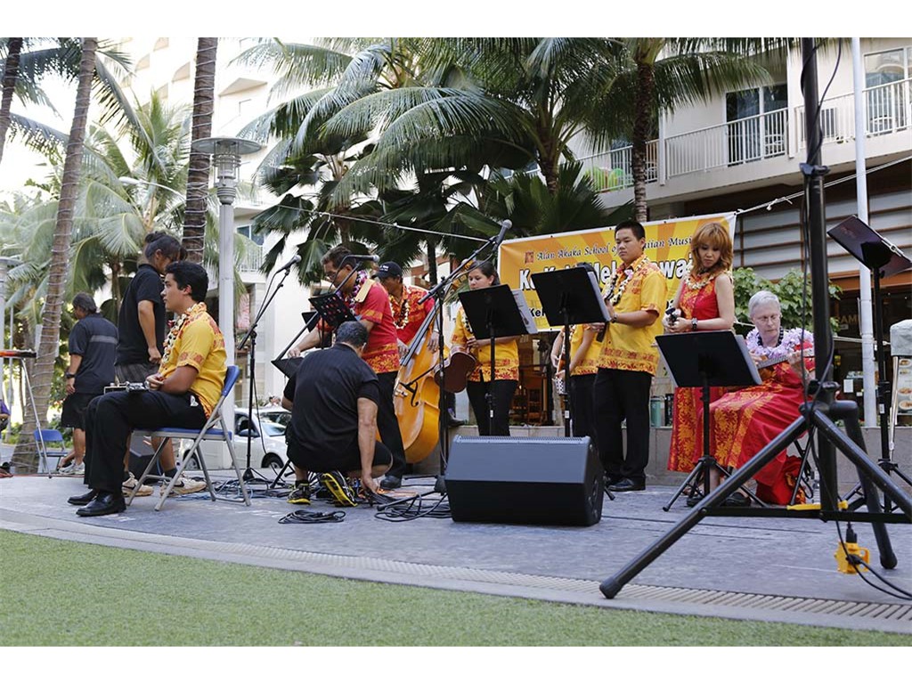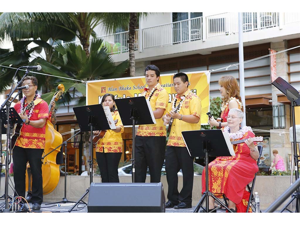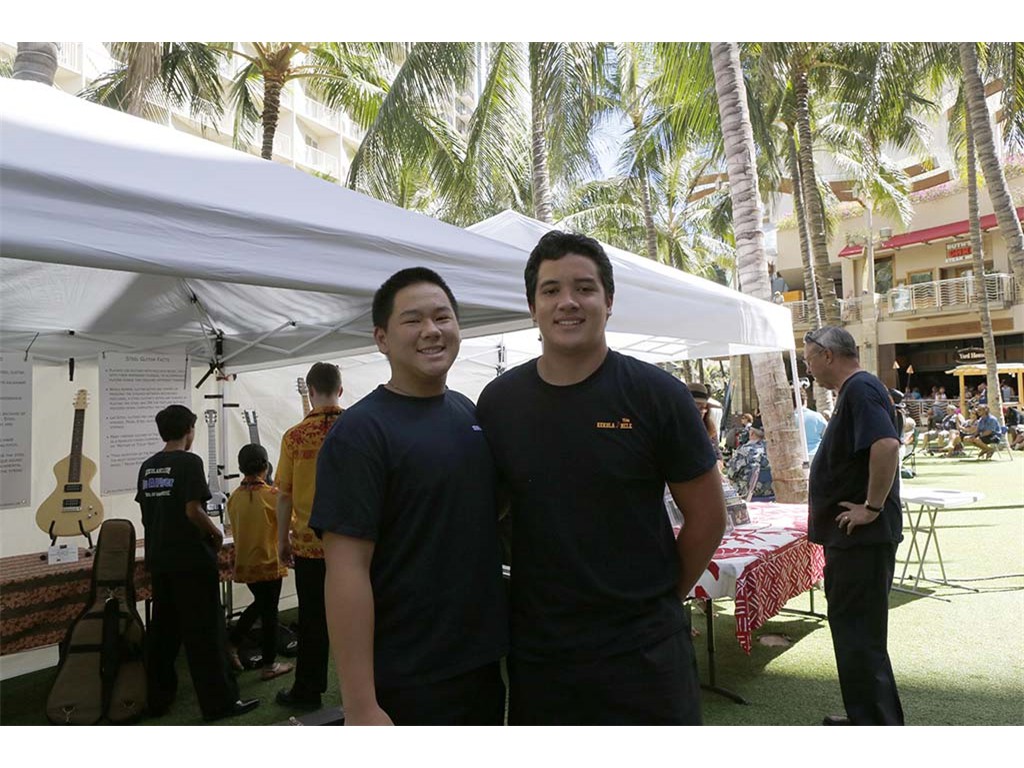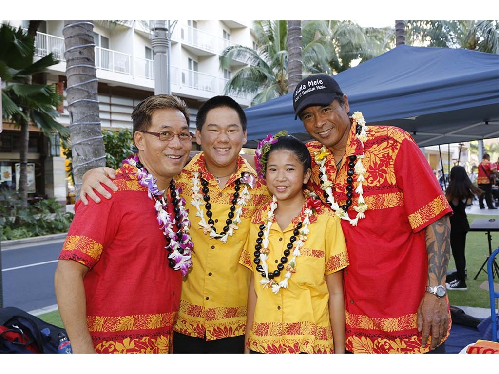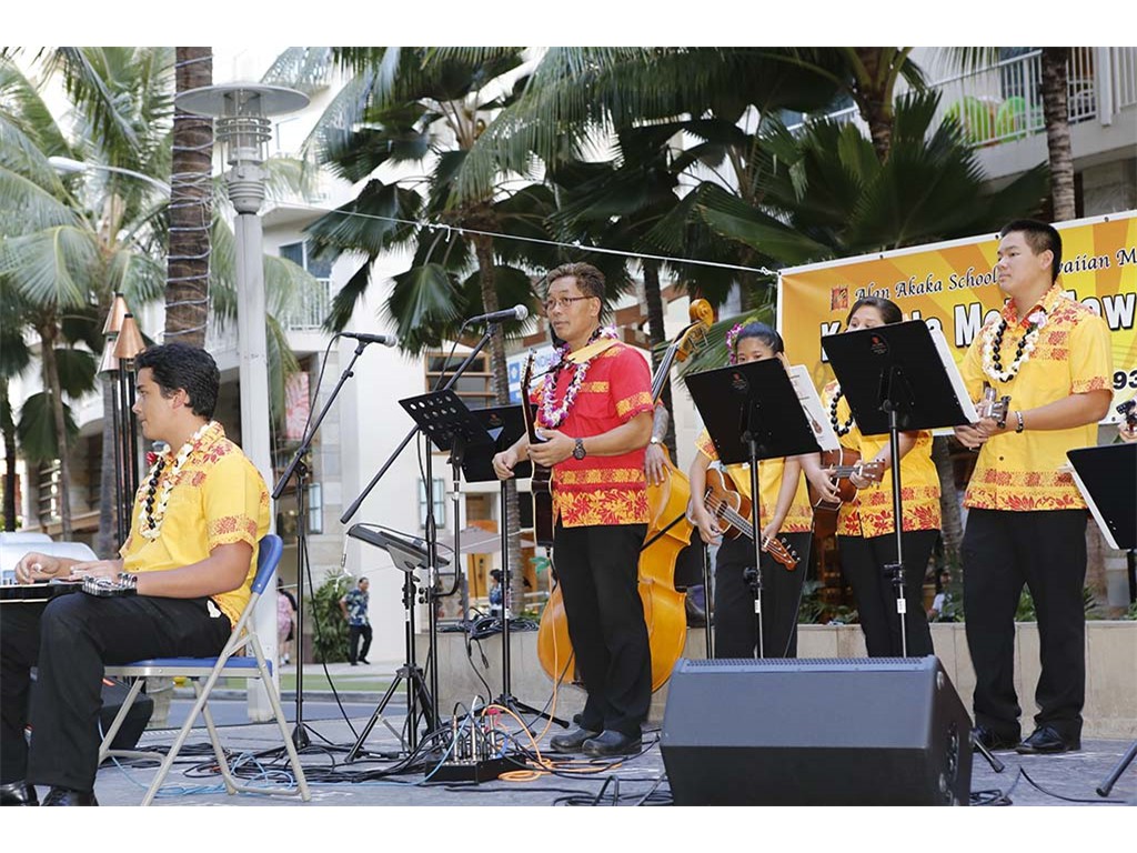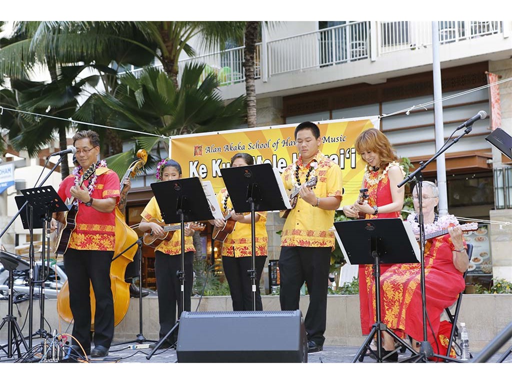 Ke Kula Mele Hawai‘i NextGen steel guitar players strutted their stuff at the 4th Annual Hawaiian Steel Guitar Festival at Waikīkī Beach Walk. Steel guitarists Alexis Tolentino, Quincy Maka‘awa‘awa, Sid Pang, Kalyn Aolani, Mālie Lyman, Keen Ching and Mark Prucha represented the NextGen players.