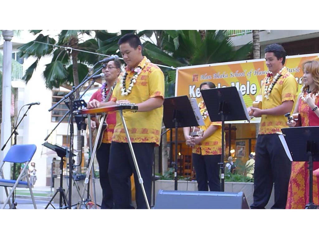 Quincy Maka'awa'awa playing ''Waikiki'' with the complete Ke Kula Mele ensemble: Alan Akaka, Ronald Tolentino, Alexis Tolentino, Cristina Villanueva, Sid Pang, Keala Akaka, Gale Warshawsky, and Lance Hylander.