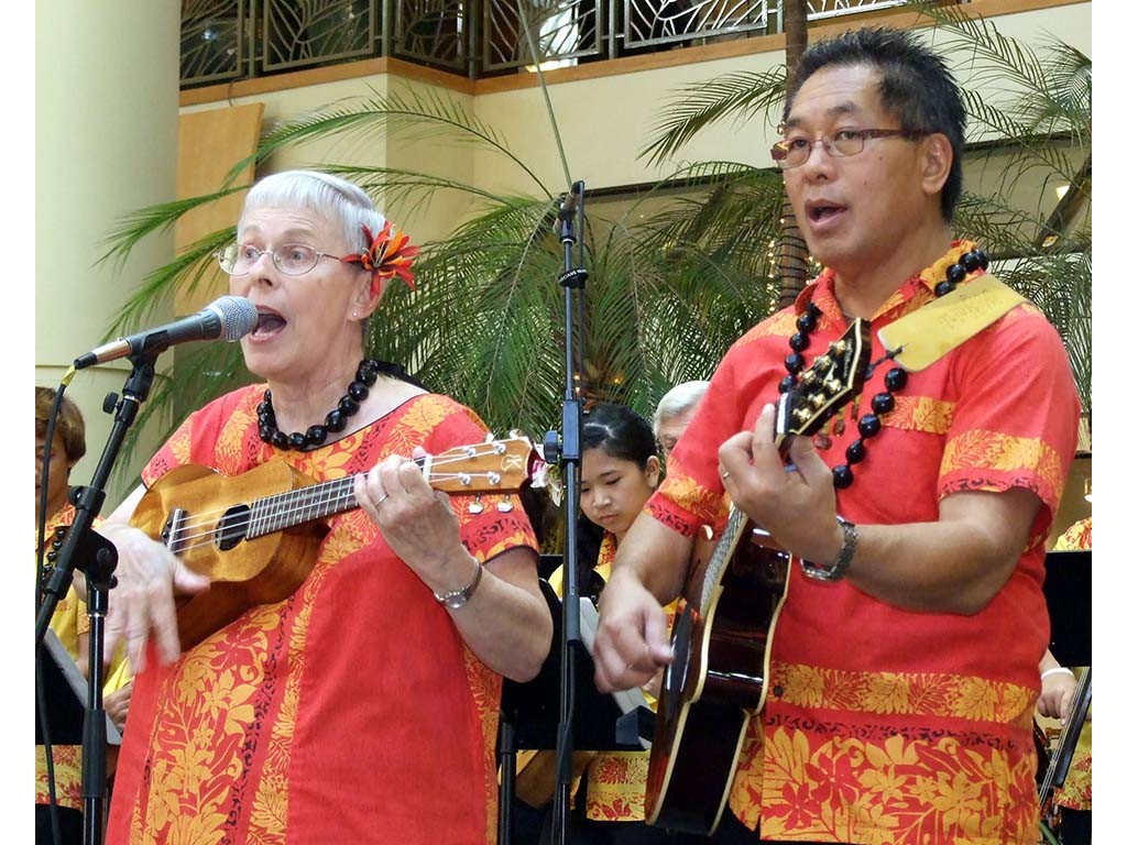 Special Concert perfomers. Front: Sid Pang, Keen Ching, Mālie Lyman, Alexis Tolentino, Cristina Villanueva. Rear: Luana Macariola, Dennis Isa, Earl Ng, Phil Sammer, Kuapapa Murai, Leroy Ne, Gale Warshawsy, Addison Ching, and Kumu Alan Akaka.