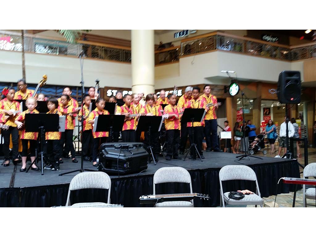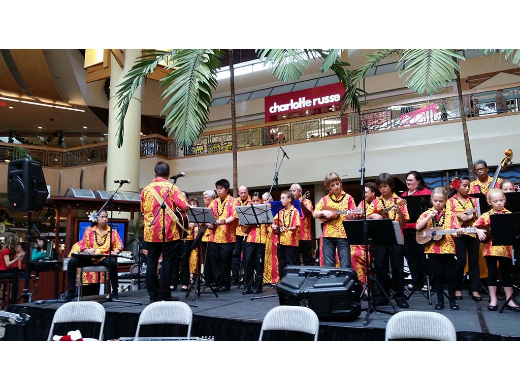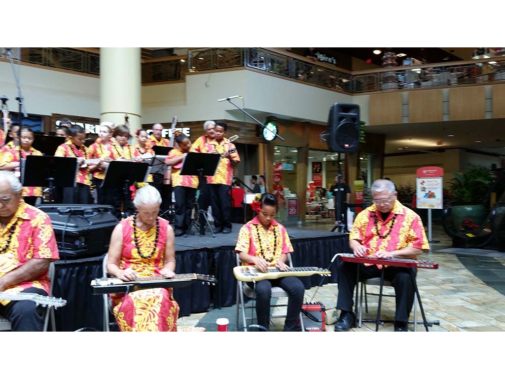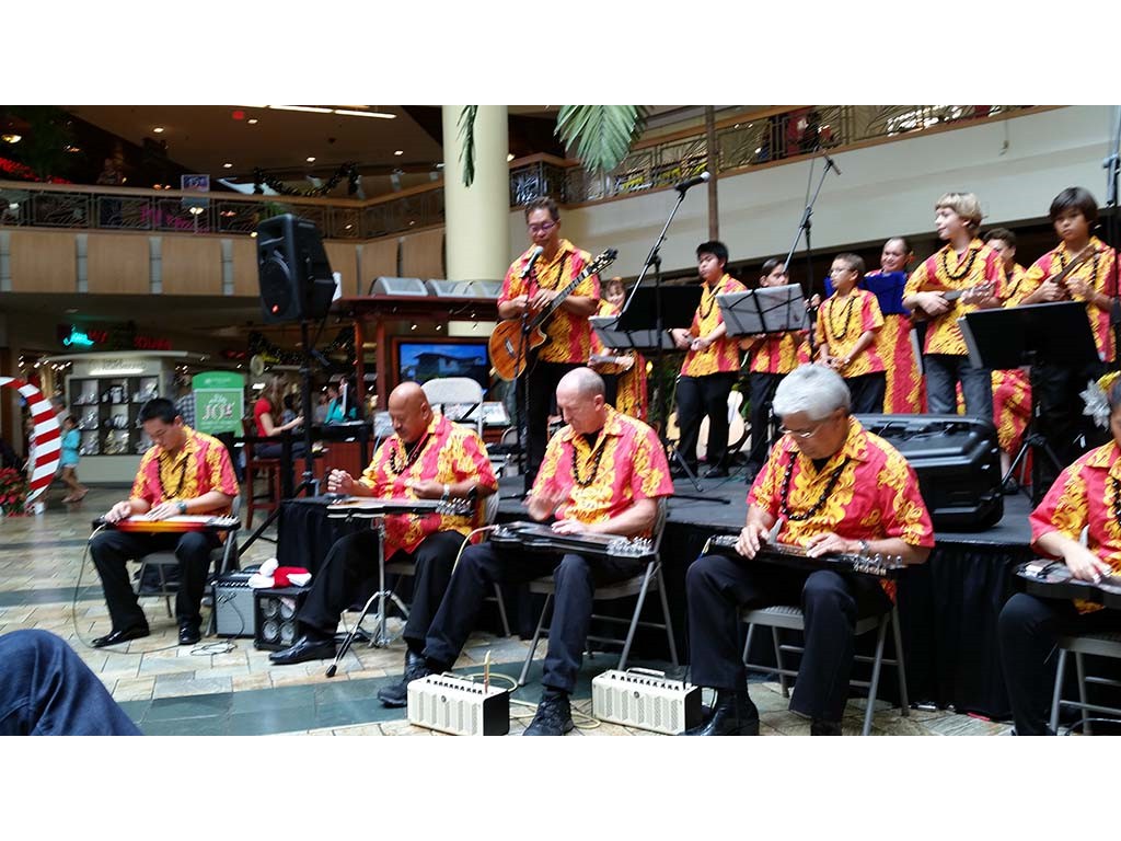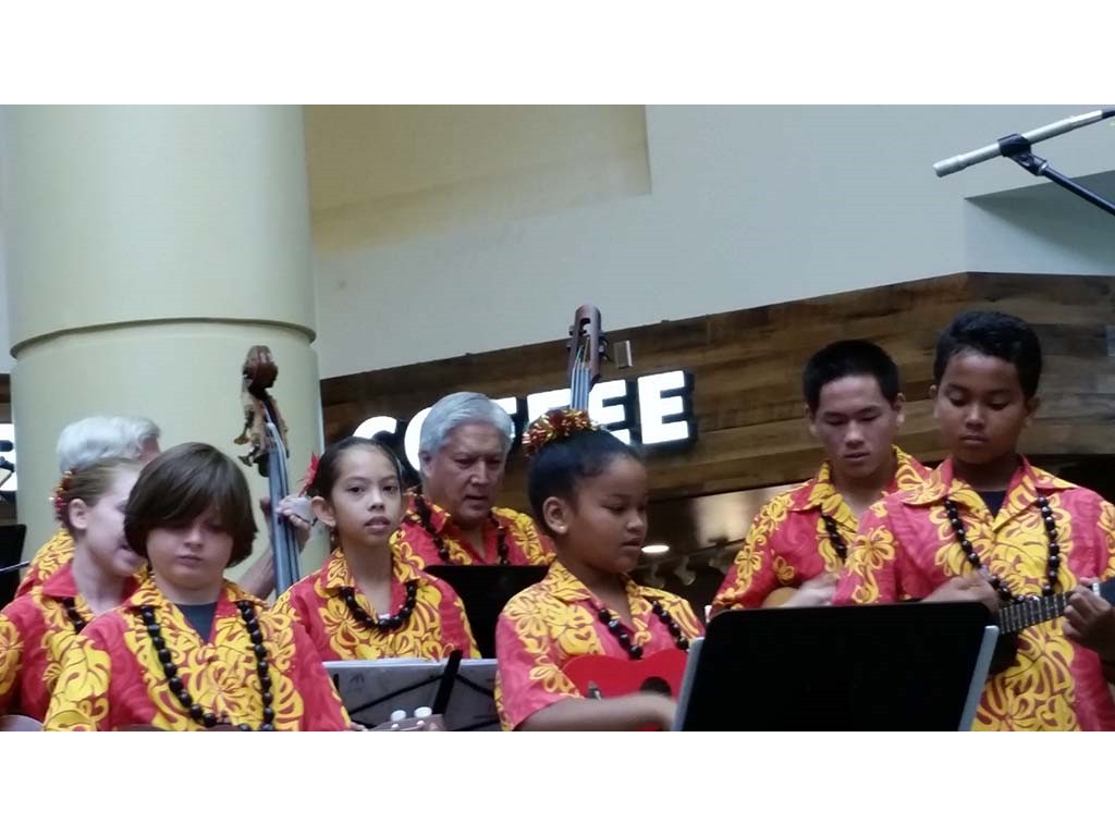 Ke Kula Mele haumana presented their annual Winter concert at the Windward Mall on December 20, 2014. The one-hour concert featured the haumana singing and playing a musical tribute to Moloka‘i, Lana‘i, Kaho‘olawe and Christmas. A highlight of the program was an ensemble of the school's steel guitar students all playing at the same time.