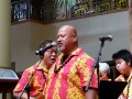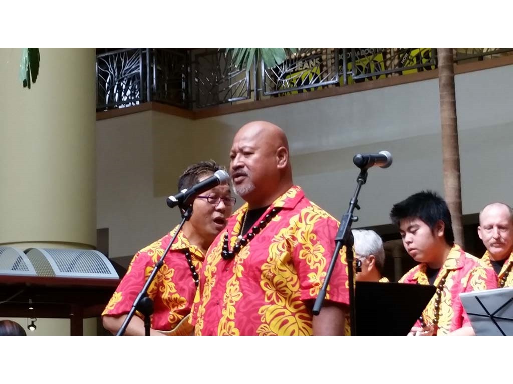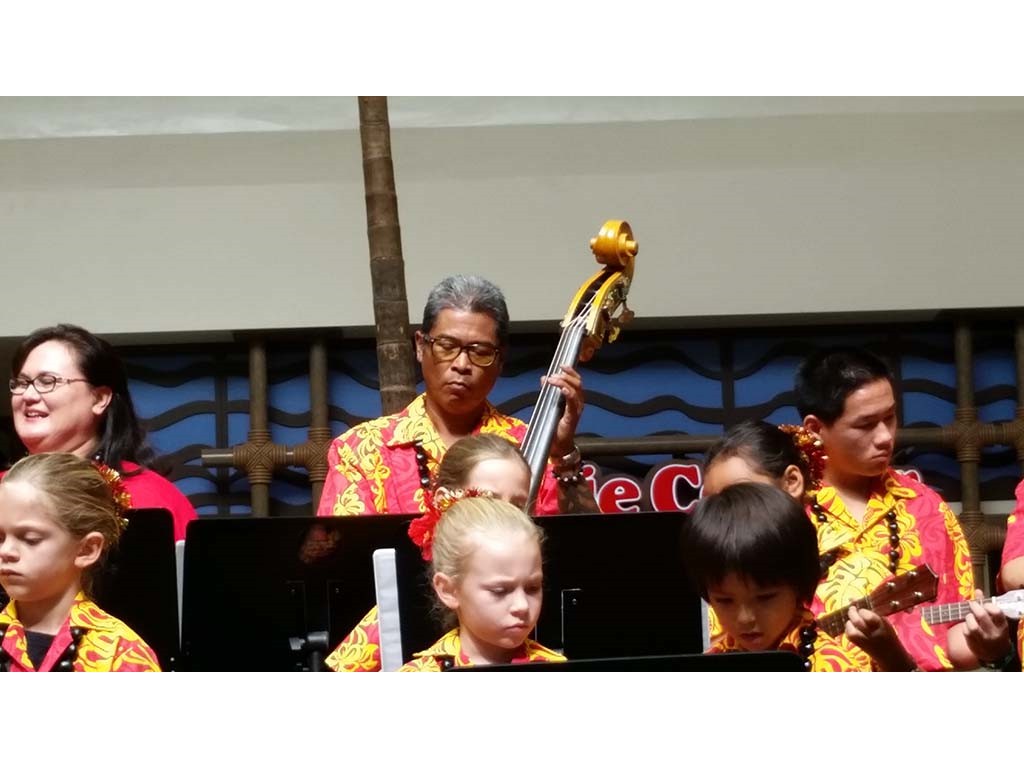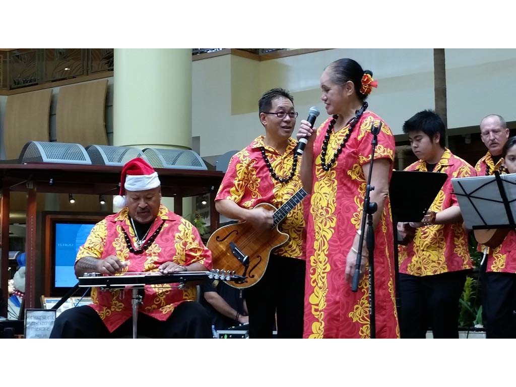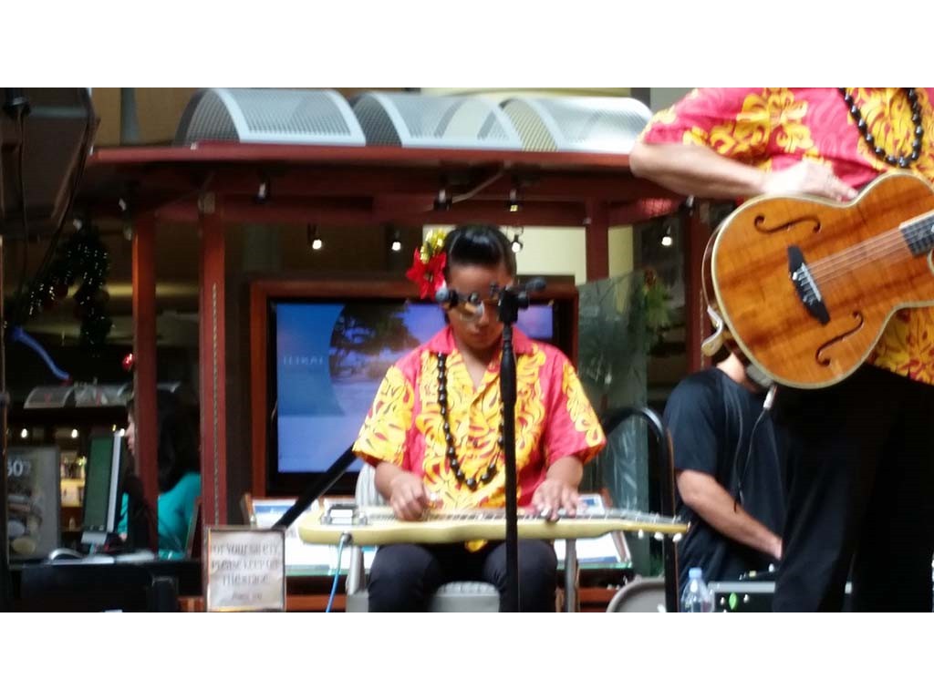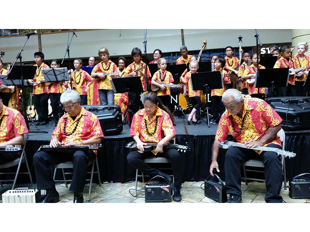 Ke Kula Mele haumana presented their annual Winter concert at the Windward Mall on December 20, 2014. The one-hour concert featured the haumana singing and playing a musical tribute to Moloka‘i, Lana‘i, Kaho‘olawe and Christmas. A highlight of the program was an ensemble of the school's steel guitar students all playing at the same time.