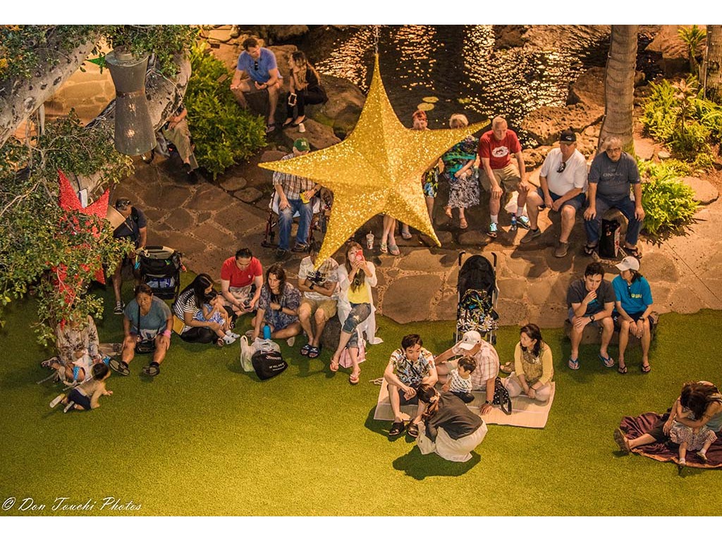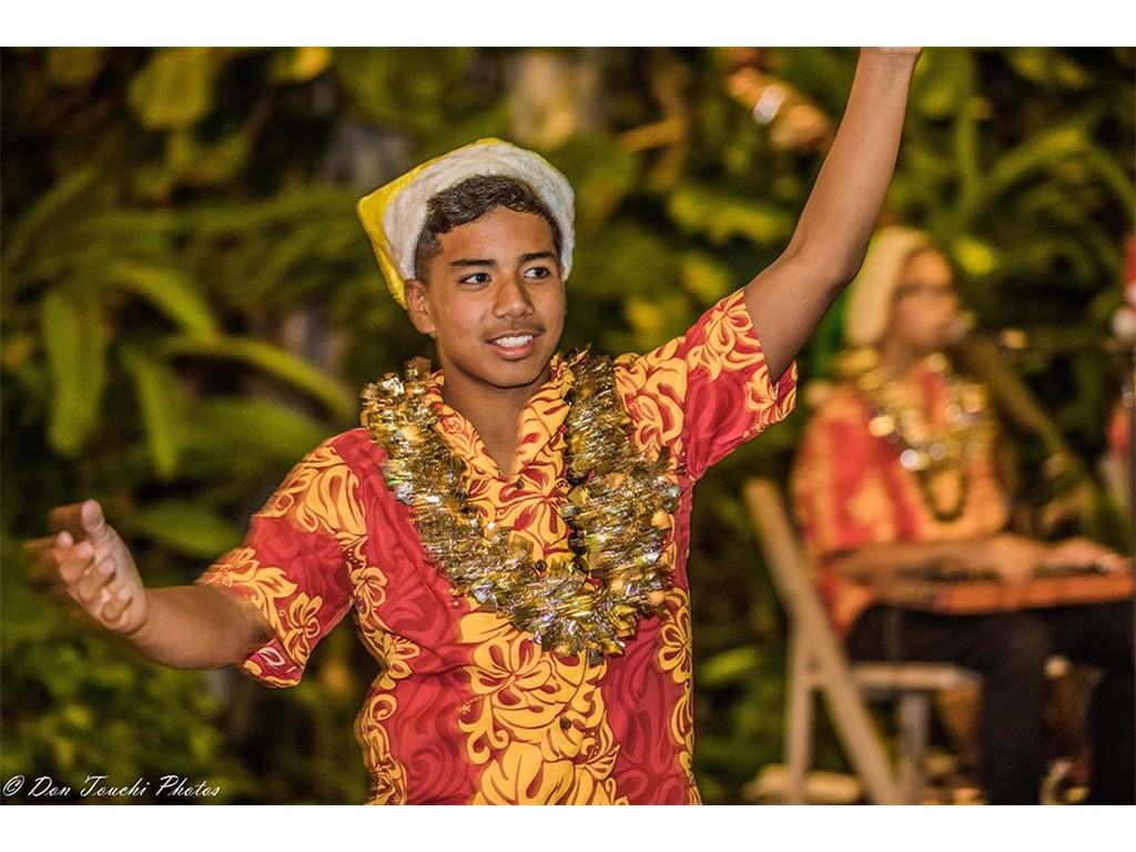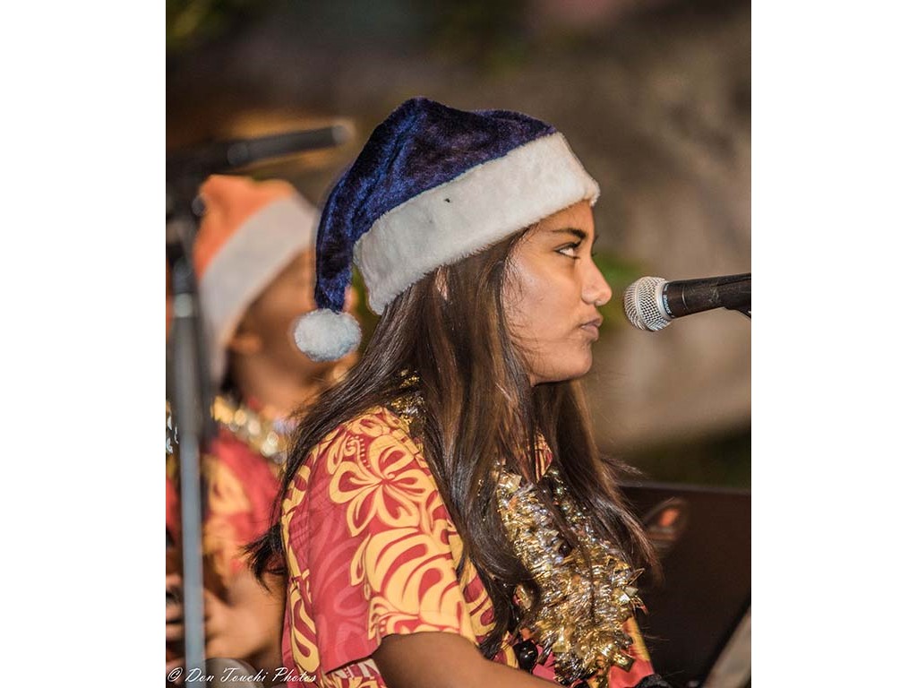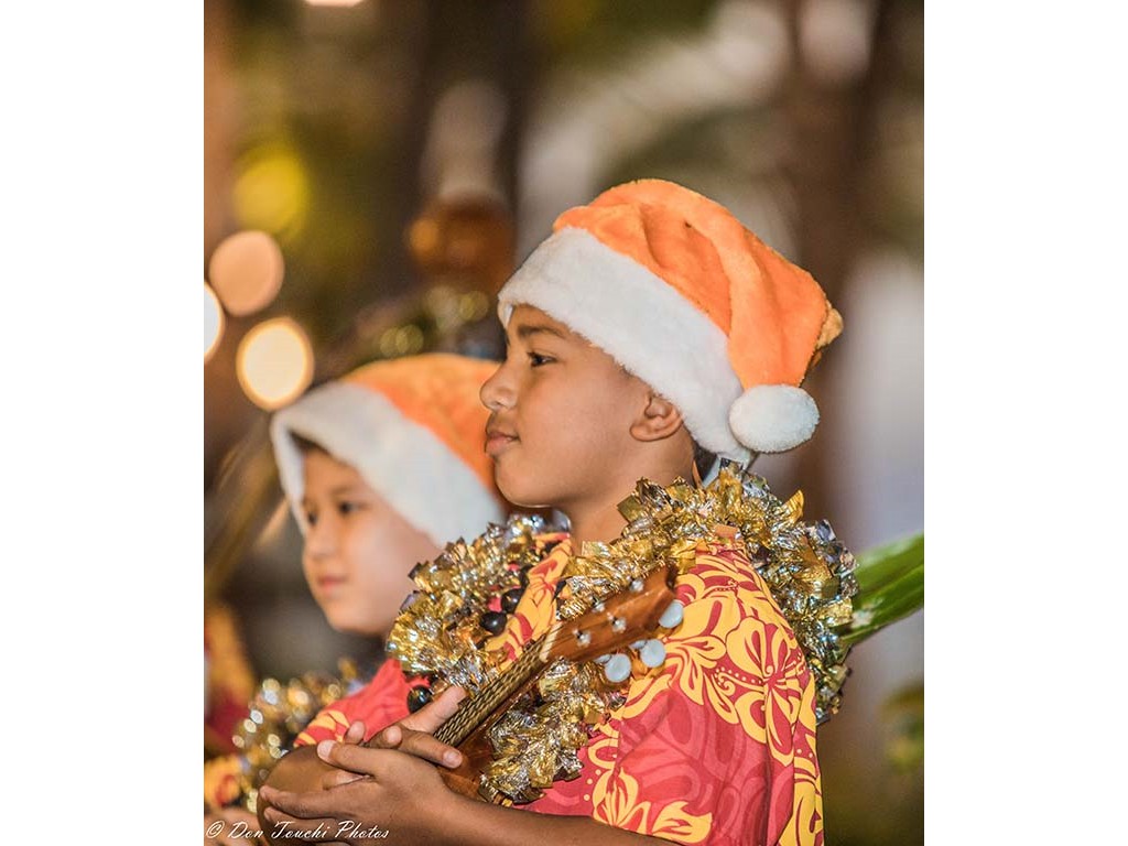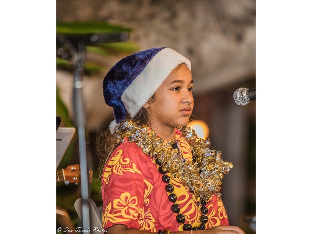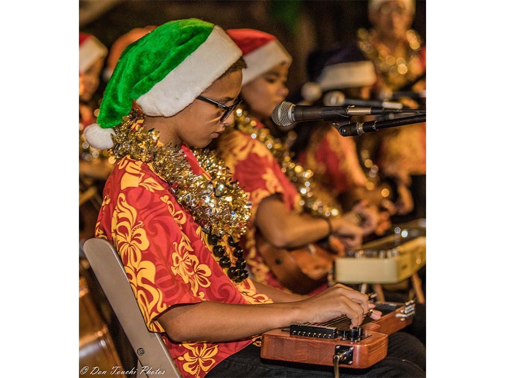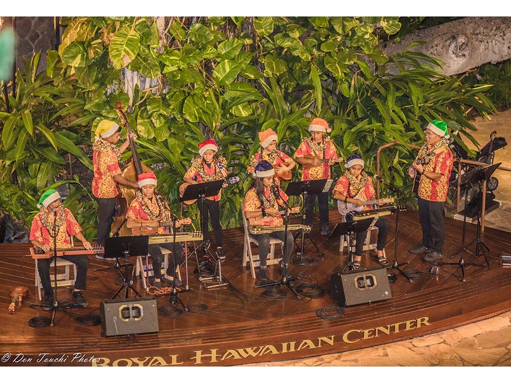 Ke Kula Mele School of Hawaiian Music steel guitarists and musicians were featured in Mele Pakolu, an ongoing musical program presented by the Royal Hawaiian Center on December 4, 2018. The 6-7 P.M. performance featured eight youth musicians ranging in age from 9 to 14 led by Kumu Alan Akaka.