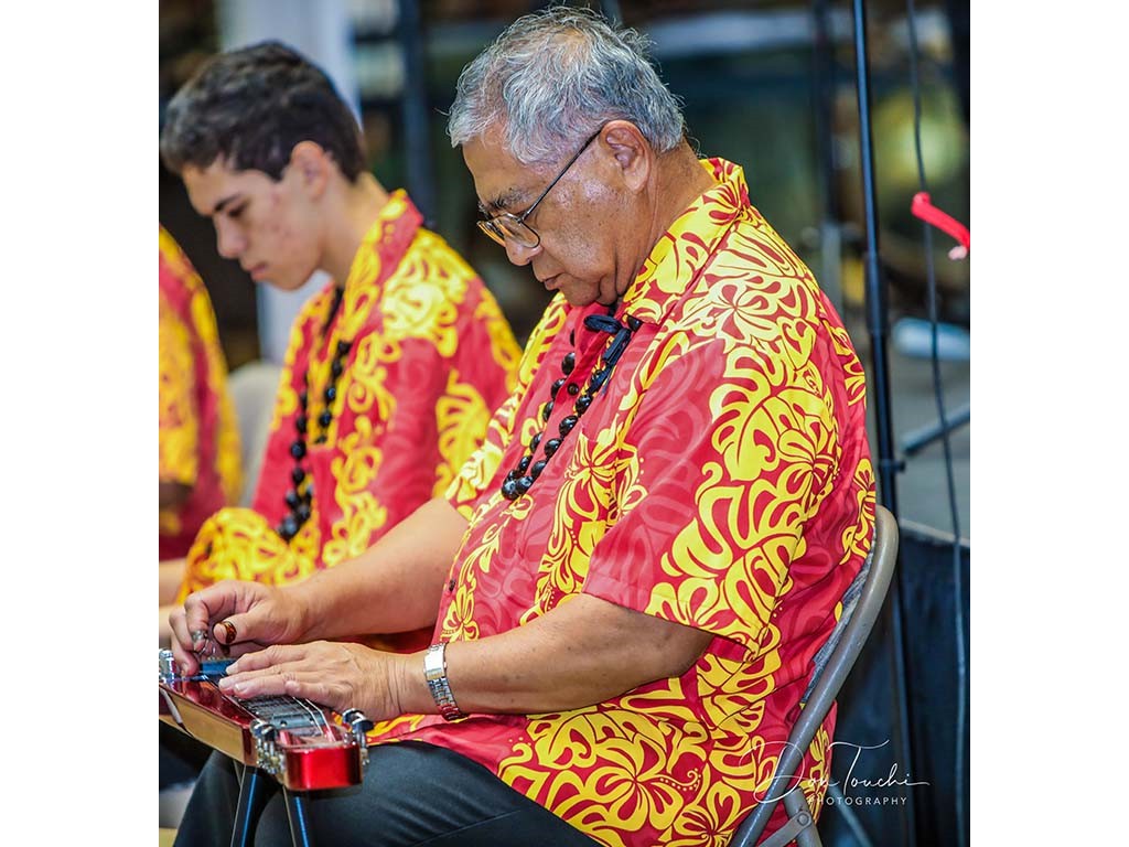 Steel guitarists Hōʻailona Mahuka and Enosa Lyman on backup ʻukulele.