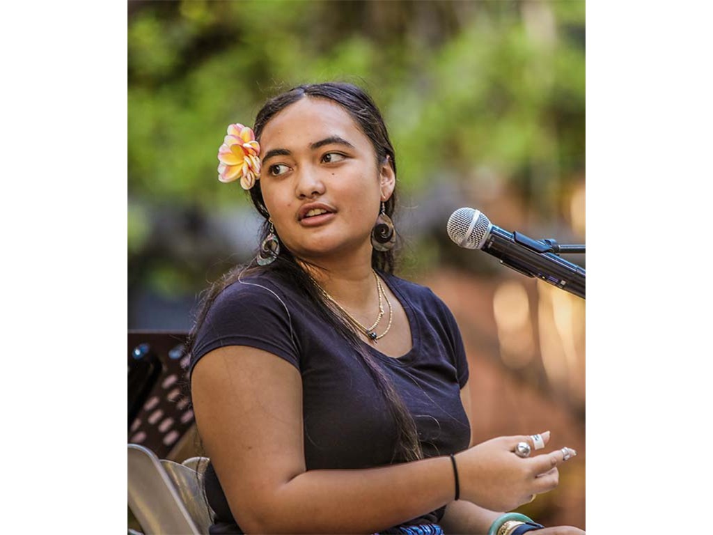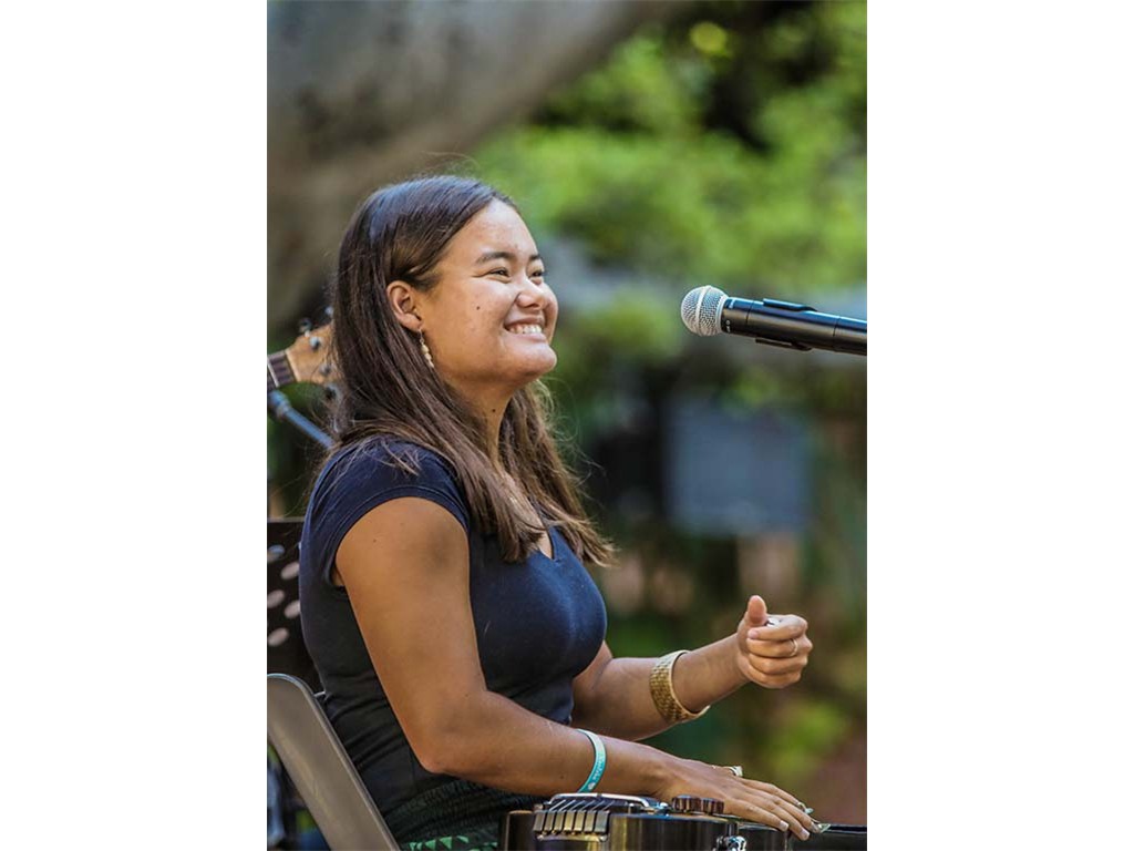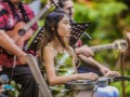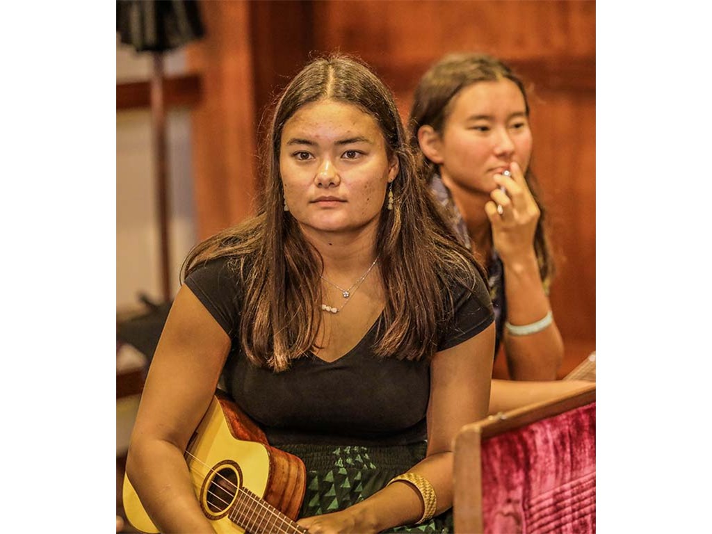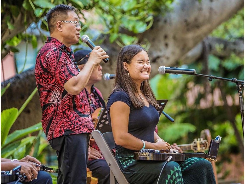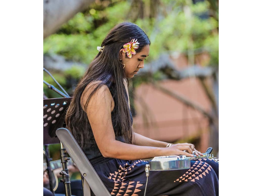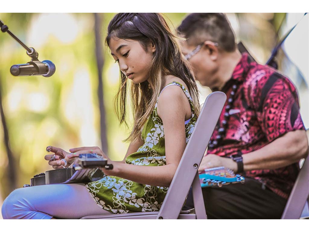 NextGen steel guitarists from Ke Kula Mele Hawai‘i School of Hawaiian Music performed during Waikīkī Steel Guitar Week. Performing at the Tuesday evening concert were Hi‘ipoi Lindsay (10), Enosa Lyman (14), Tai Misailidis (15), Makamae Lyu-Napoleon (16), Isabella Bertelmann (16), Pono Fernandez (17), and Joey Misailidis (18).