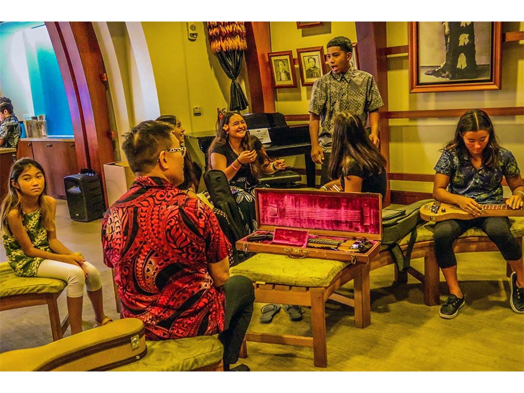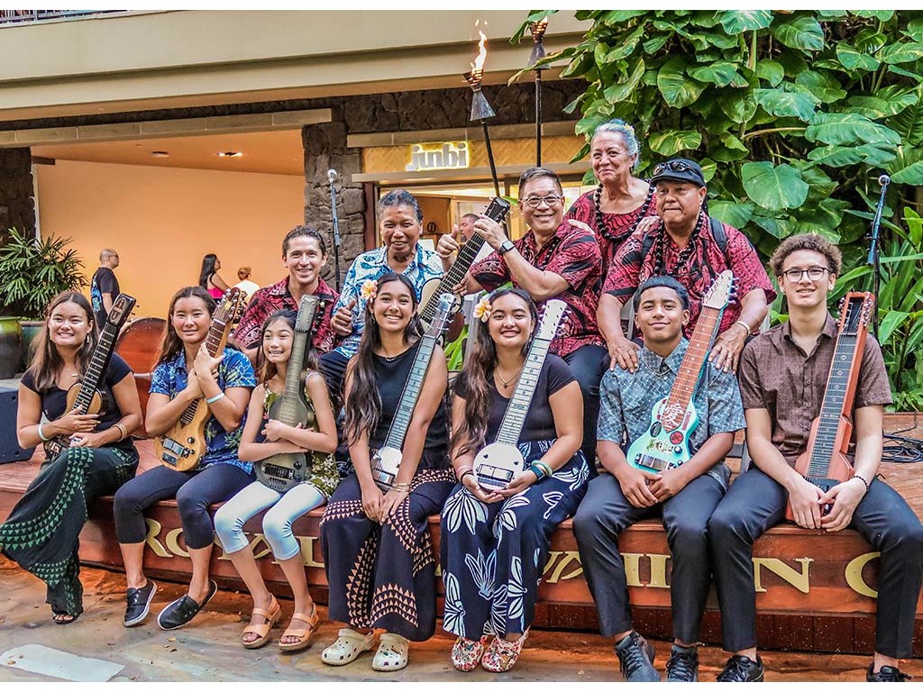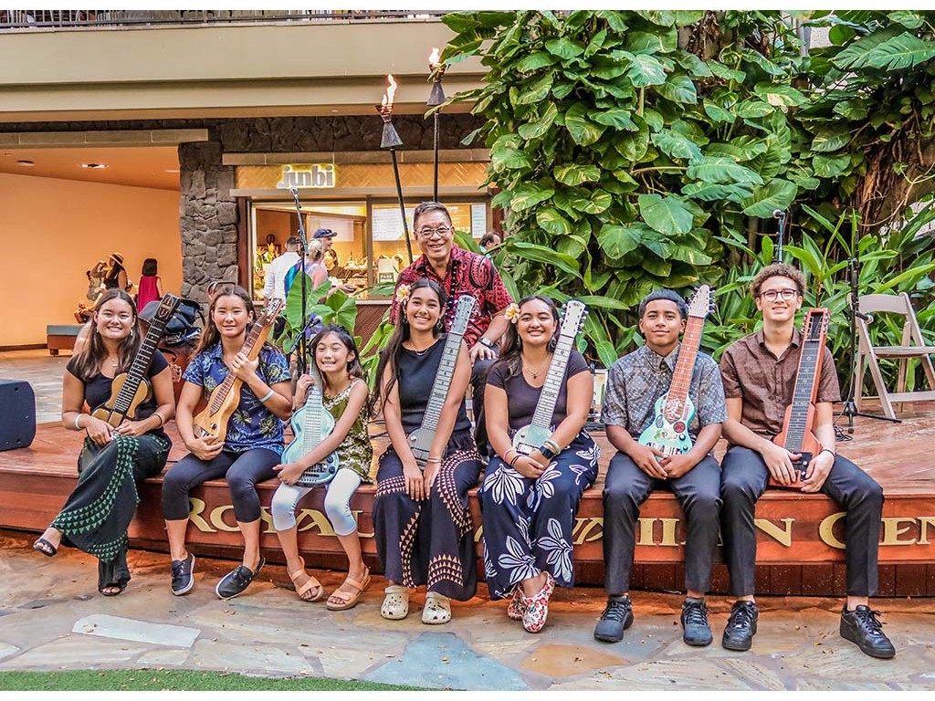NextGen steel guitarists Joey Misailidis, Tai Misailidis, Hiʻipoi Lindsay, Isabella Bertelmann, Makamae Lyu-Napoleon, Enosa Lyman, and Pono Fernancez with kumu Alan Akaka.
